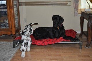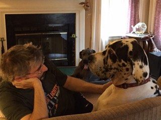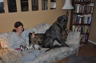 I had always wanted a Harlequin Great Dane and was so incredibly excited a few years ago when my husband showed me a picture of Sebastian online when I got home from work. He was an adorable 4-5 week old puppy at the time being advertised for sale on the Internet through a breeder about three hours from us. I had been teaching summer school that year, so my husband suggested I use my summer school pay to buy him since it was extra income for us. :) He was my dream dog, and two years before I had been diagnosed with thyroid cancer and gone through treatment, so I was really wanting this cuddly puppy to brighten things up.