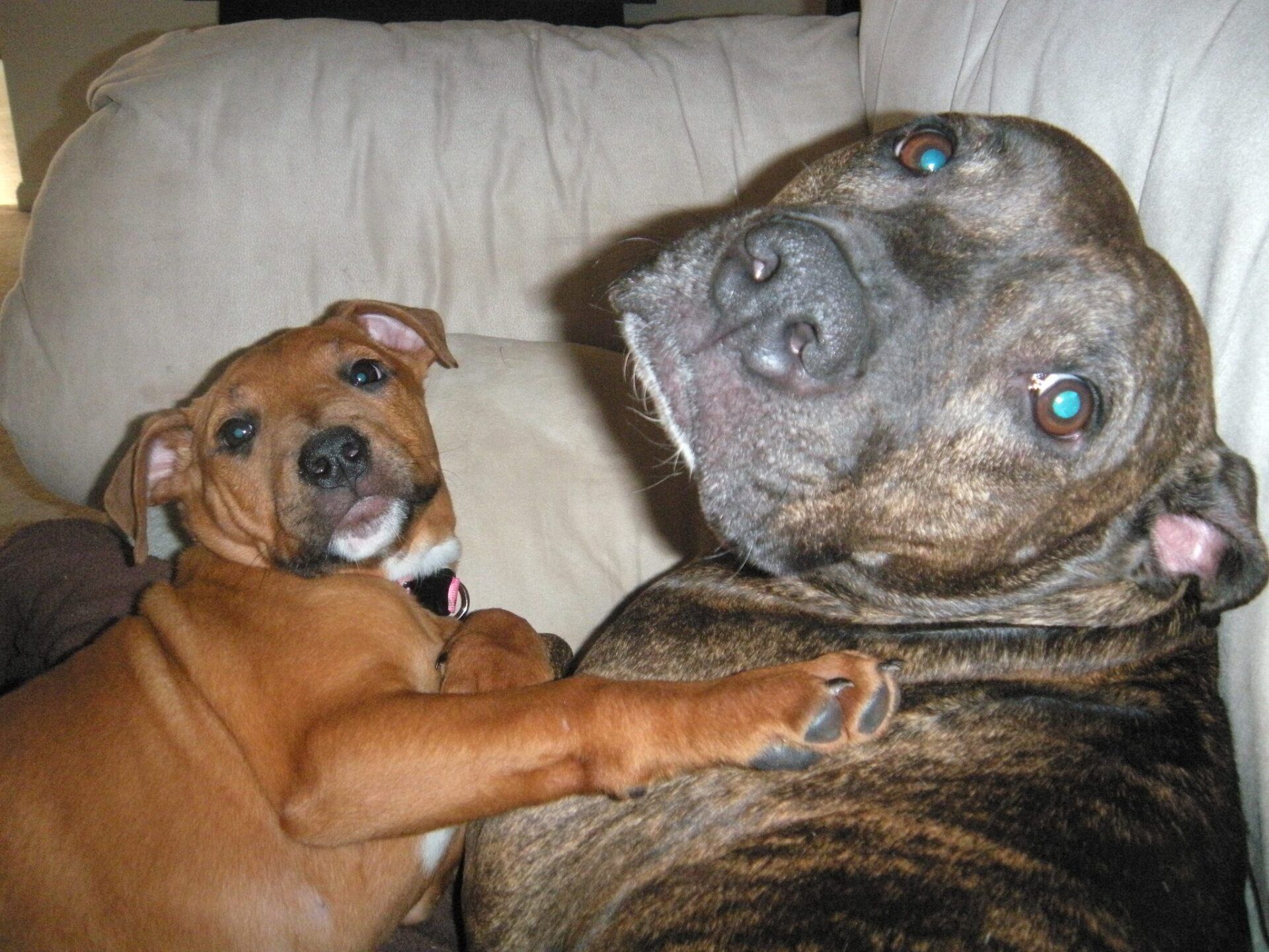 We found PeeWee in Nashville Tn, a little over a year ago. We believe he spent the first part of his life being mistreated and abused. He had lost most of his hair and weighed around 20lbs. We think he was close to death. We decided that we wanted to save this poor baby from the life of the streets and give him a warm loving home. Now, after a lot of tender, loving care, PeeWee is pushing 60 lbs and has a beautiful shiny brindle coat.